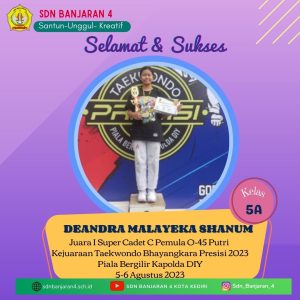 - Deandra Malayeka Shanum Juara 1 Super Cader C Pemula O-45 Putri (Kelas 5A)