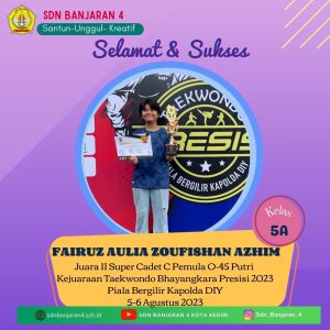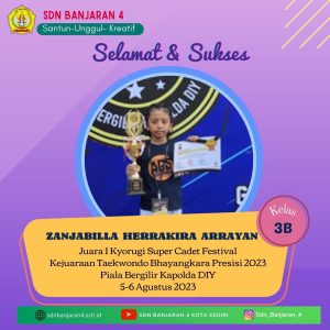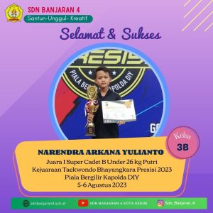 Empat siswa SD Negeri Banjaran 4, berhasil meraih prestasi gemilang dalam Kejuaraan Taekwondo Bhayangkara Presisi 2023 Piala Bergilir Kapolda Daerah Istimewa Yogyakarta yang digelar di Gedung Olahraga Amongrogo Yogyakarta pada hari Sabtu – Ahad (05-06/07/23).